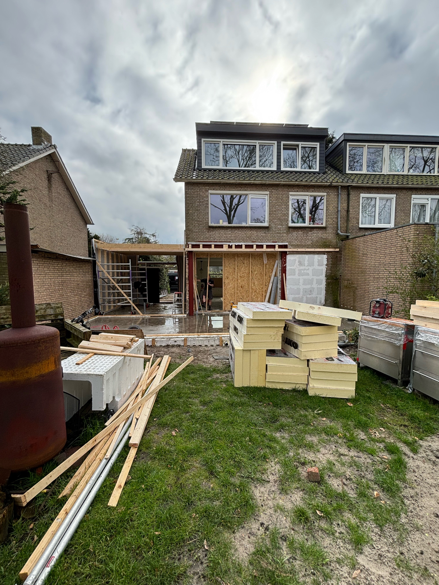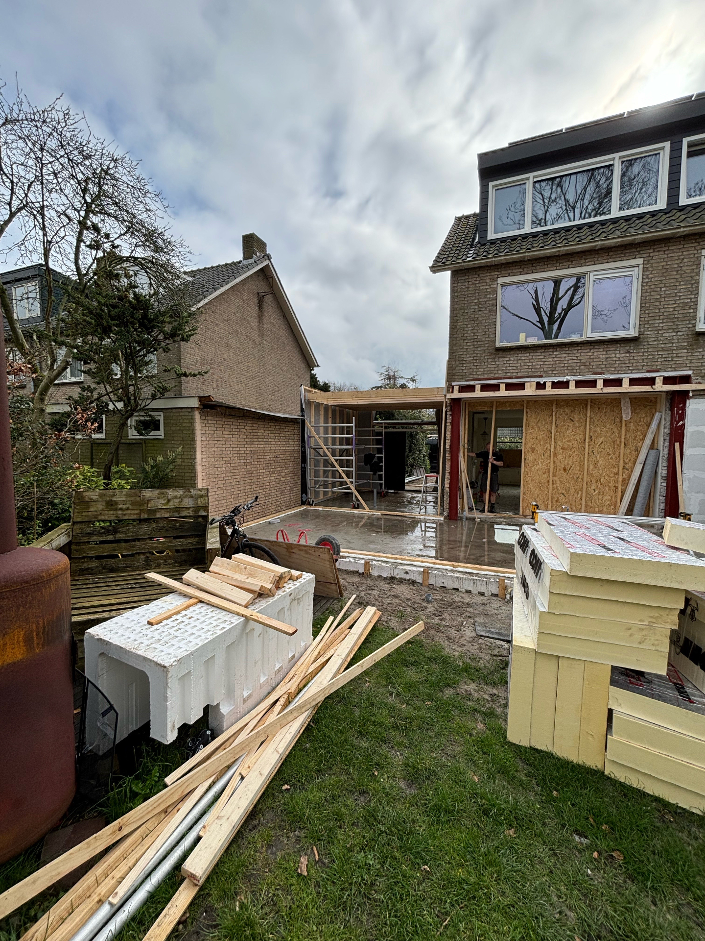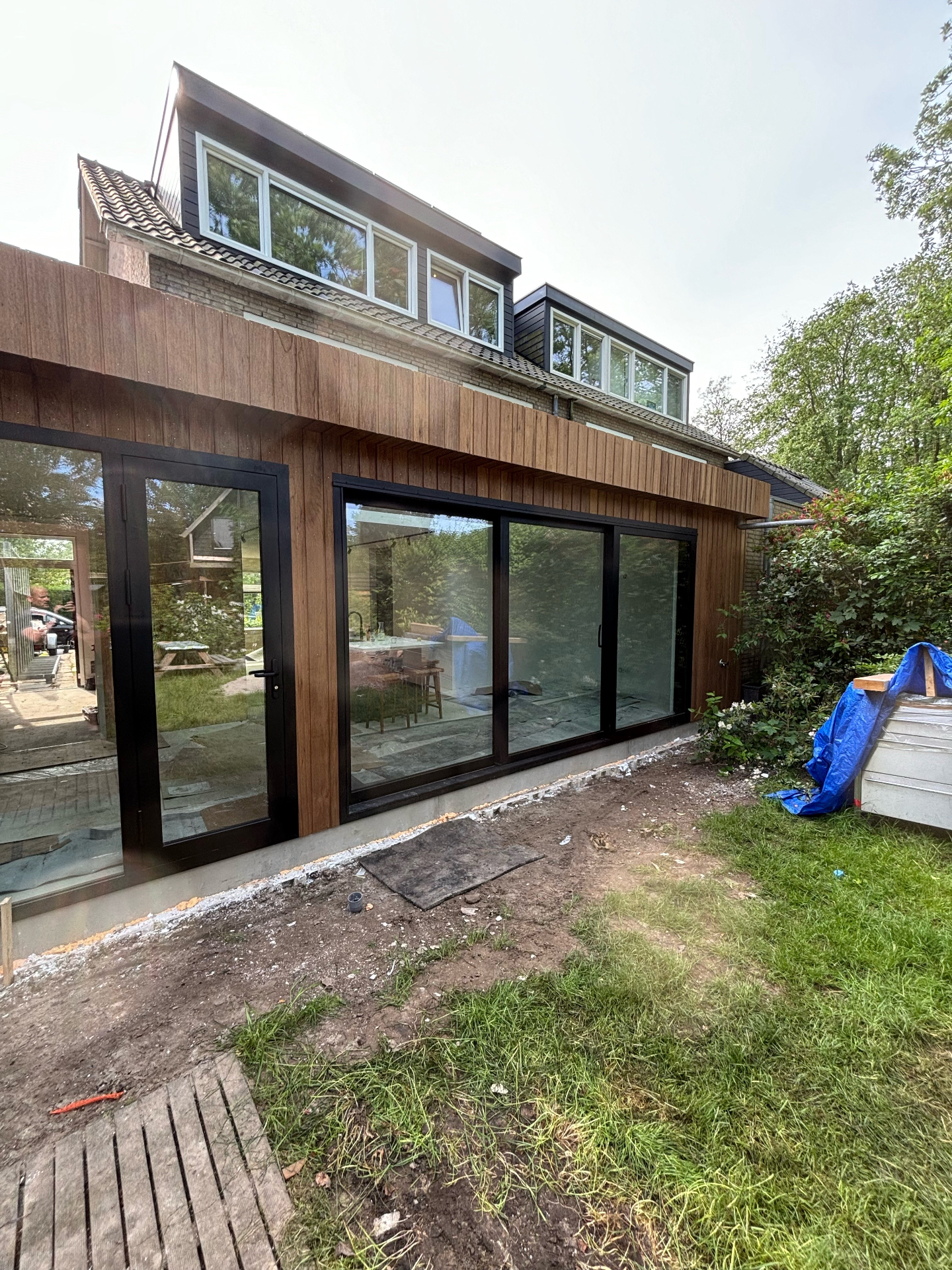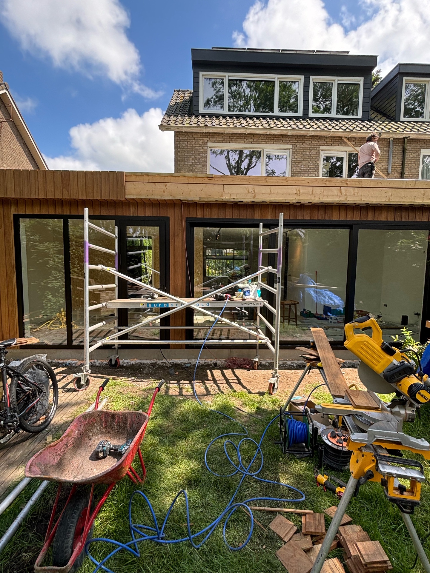 Voor familie Leijting realiseerden we een moderne achteraanbouw die het woonkamer- en keukenvolume vergroot en een sterke visuele verbinding met de tuin creëert. In de foto’s is de bijna voltooide gevel te zien met verticale houten bekleding en grote zwarte aluminium puien die veel daglicht binnenlaten. Binnen is de nieuwe betonvloer gestort en zien we de open constructie met OSB-wanden en zichtbare balklagen klaar voor afwerking.