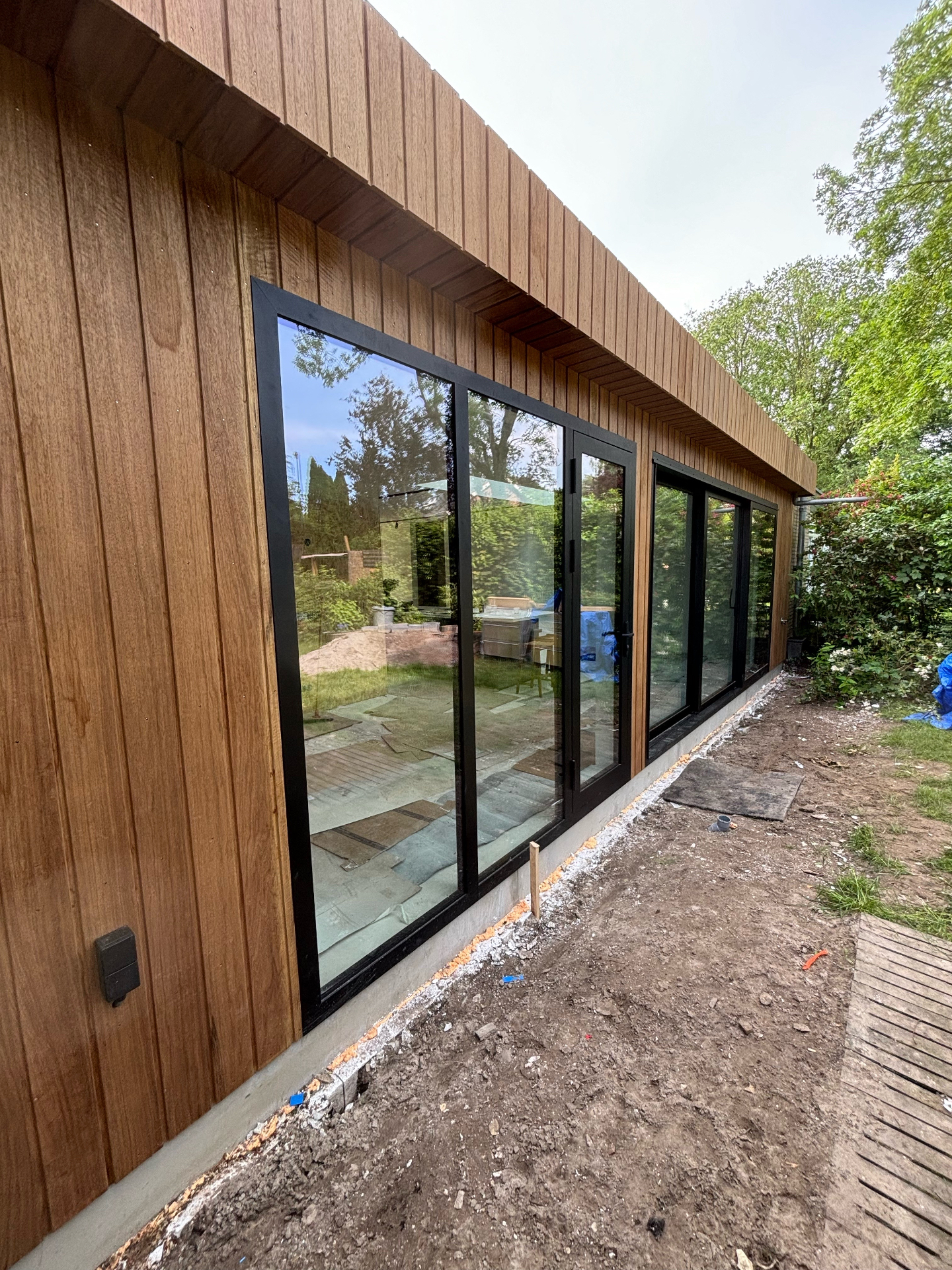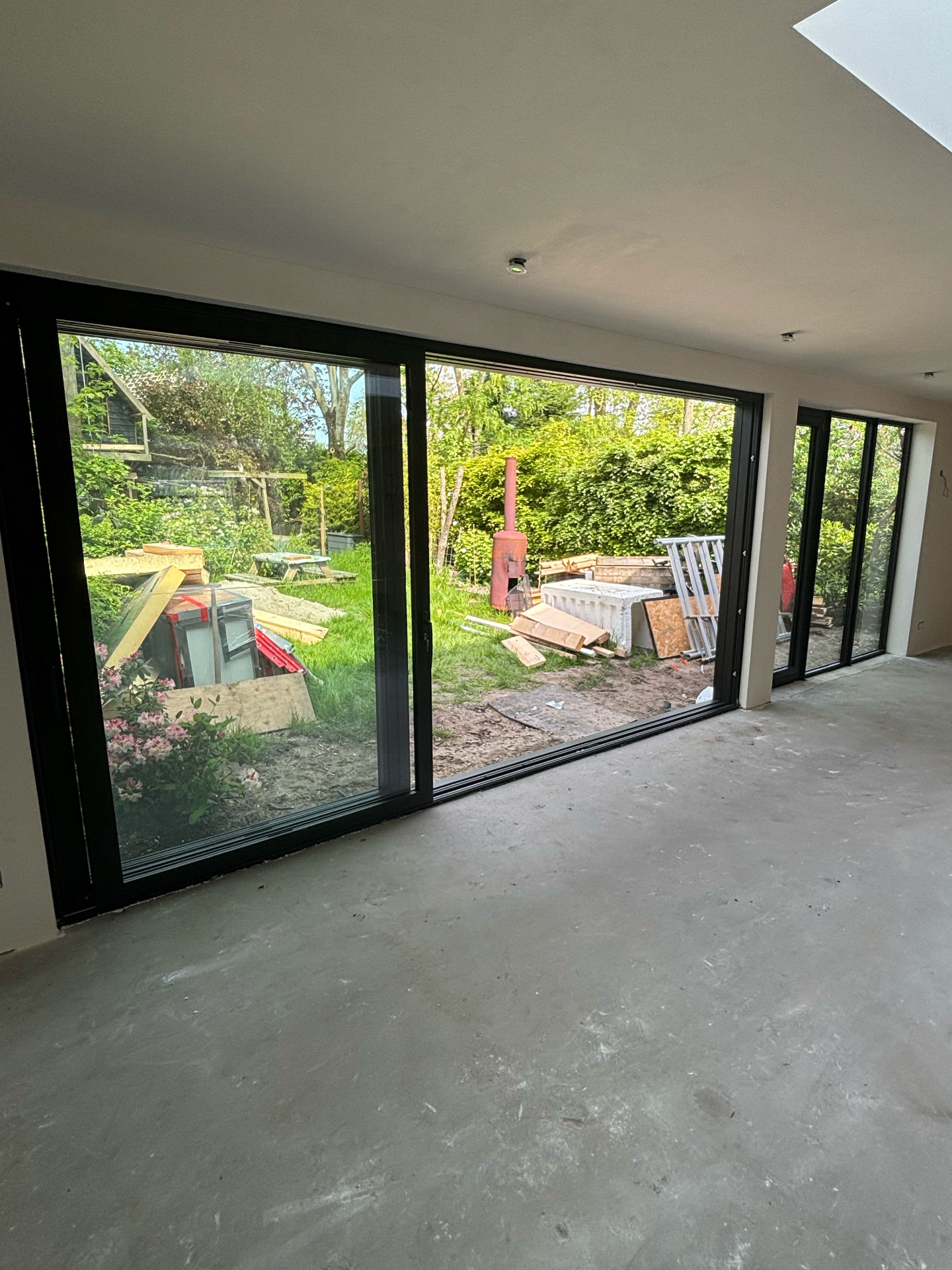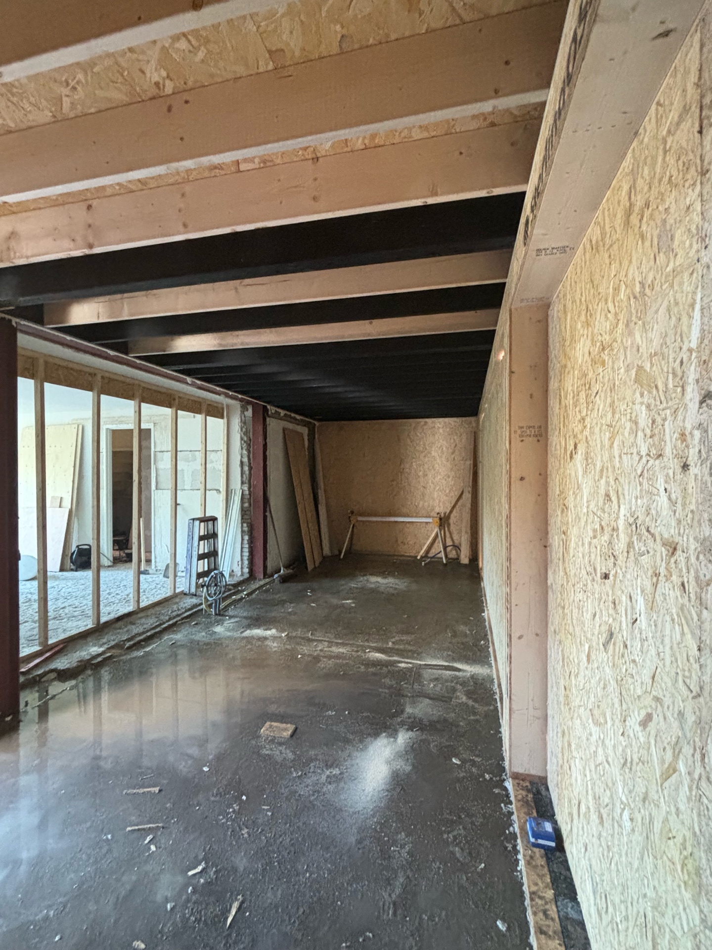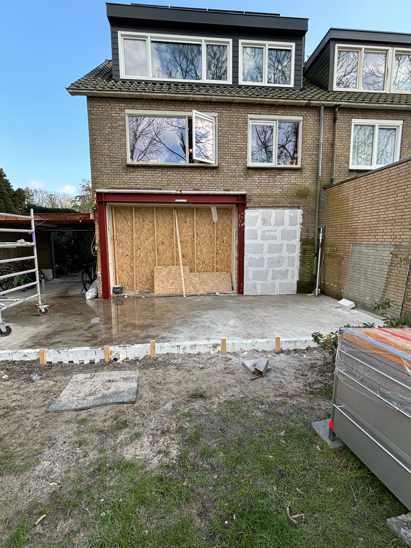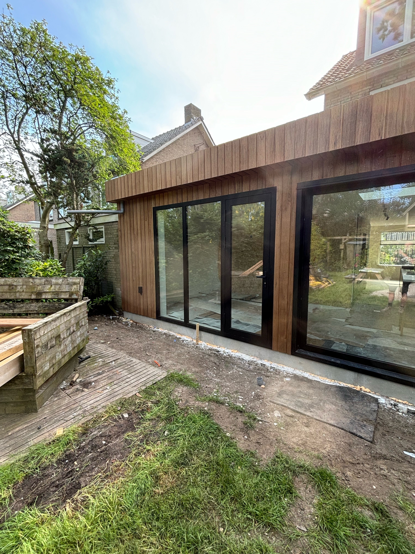 Voor familie Leijting realiseerden we een moderne achteraanbouw die het woonkamer- en keukenvolume vergroot en een sterke visuele verbinding met de tuin creëert. In de foto’s is de bijna voltooide gevel te zien met verticale houten bekleding en grote zwarte aluminium puien die veel daglicht binnenlaten. Binnen is de nieuwe betonvloer gestort en zien we de open constructie met OSB-wanden en zichtbare balklagen klaar voor afwerking.