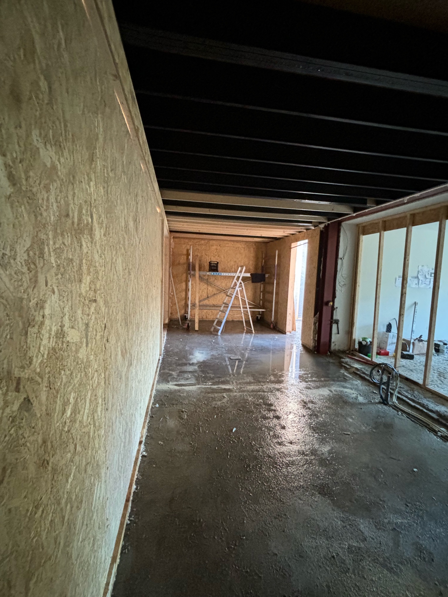 - Interne afbouw: OSB-wanden, zichtbare houten balklaag en voorbereide ruimtes voor installaties en afwerking.