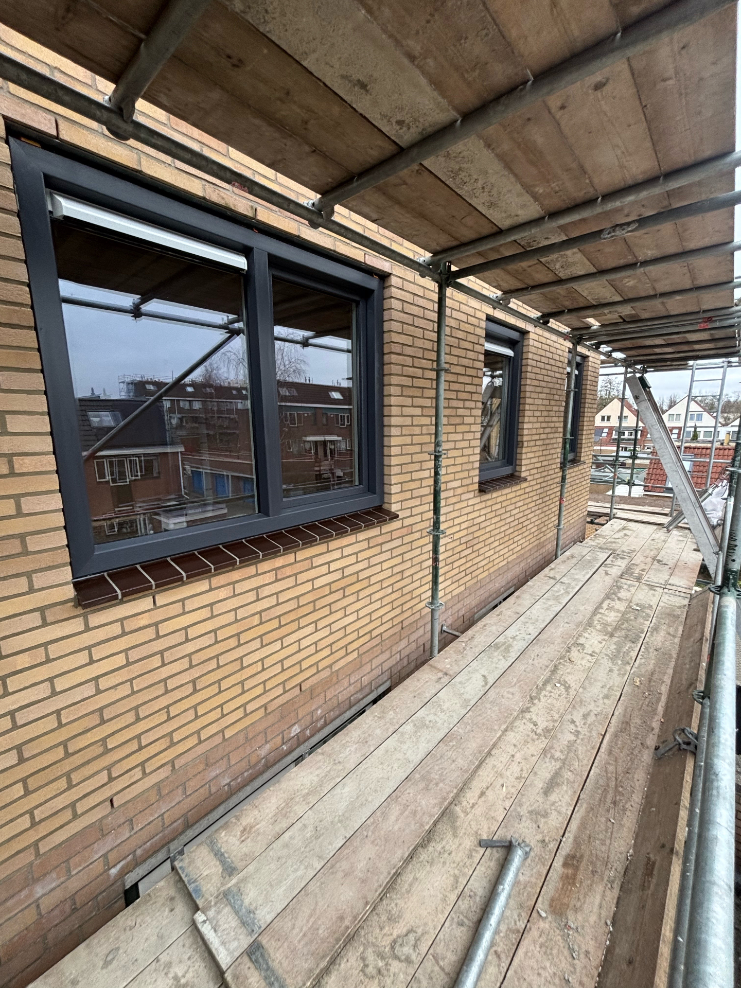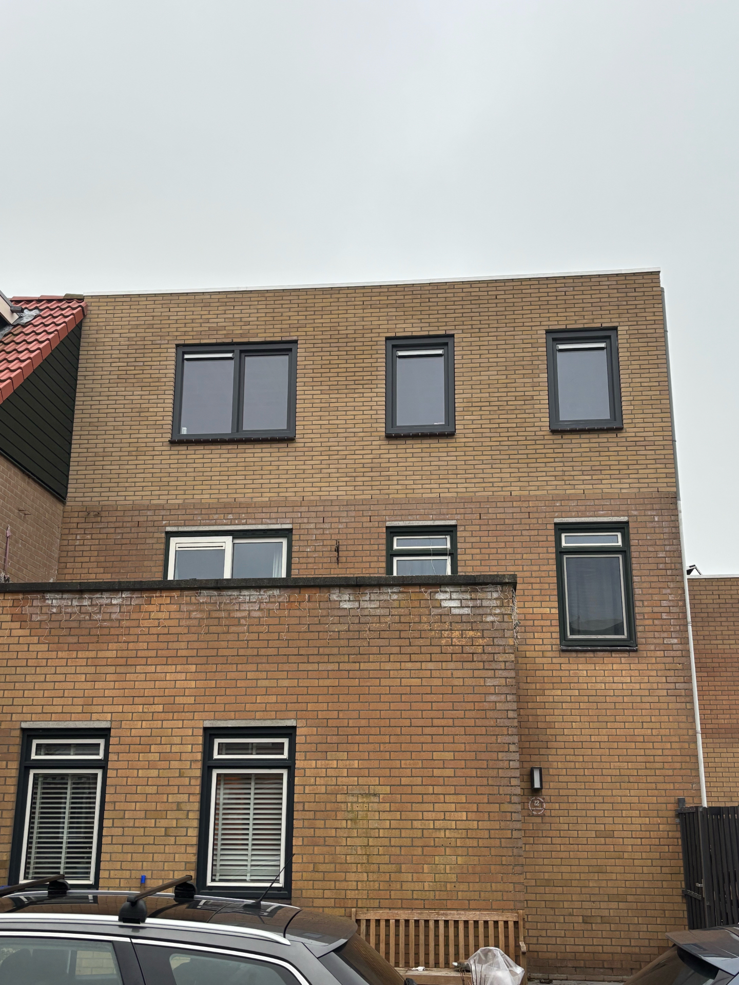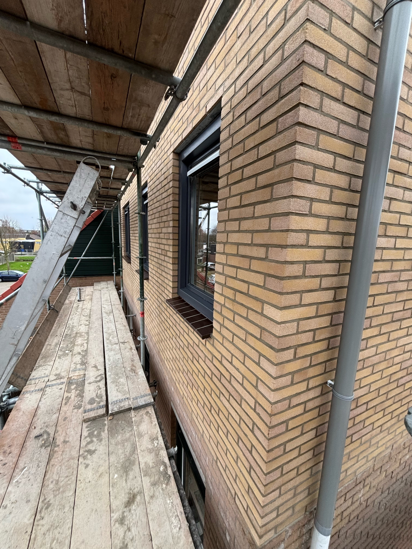 De gevels tonen bestaande geelbruine gevelstenen met plaatselijk zoutuitbloei en voegen die we tijdens de afbouw hebben gedetailleerd aangesloten op de nieuwe raamkozijnen. De nieuwe buitenkozijnen zijn antraciet uitgevoerd en sluiten strak aan op de bestaande gevels, wat het gebouw een moderne, nette uitstraling geeft.
