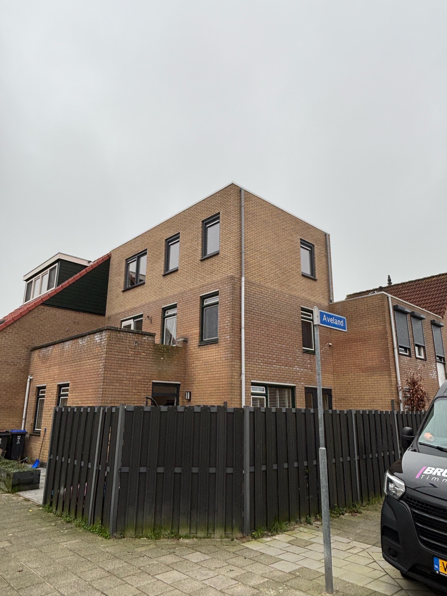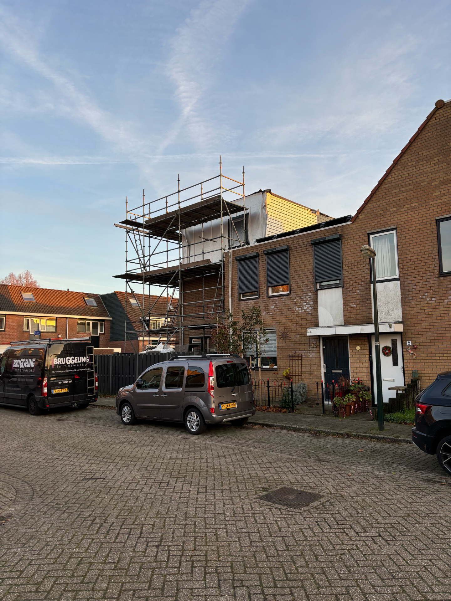 Voor familie Dalmulder realiseerden we een houtskelet dakopbouw op een bestaande rijwoning aan de Aveland. Op de foto’s is de nieuwe opbouw duidelijk zichtbaar: een rechthoekige, volledig metselwerk-onderbouw waarop een lichte houtskeletconstructie met OSB-beplanking is geplaatst. Rondom is steigerwerk geplaatst voor veilige toegang en werkruimte.