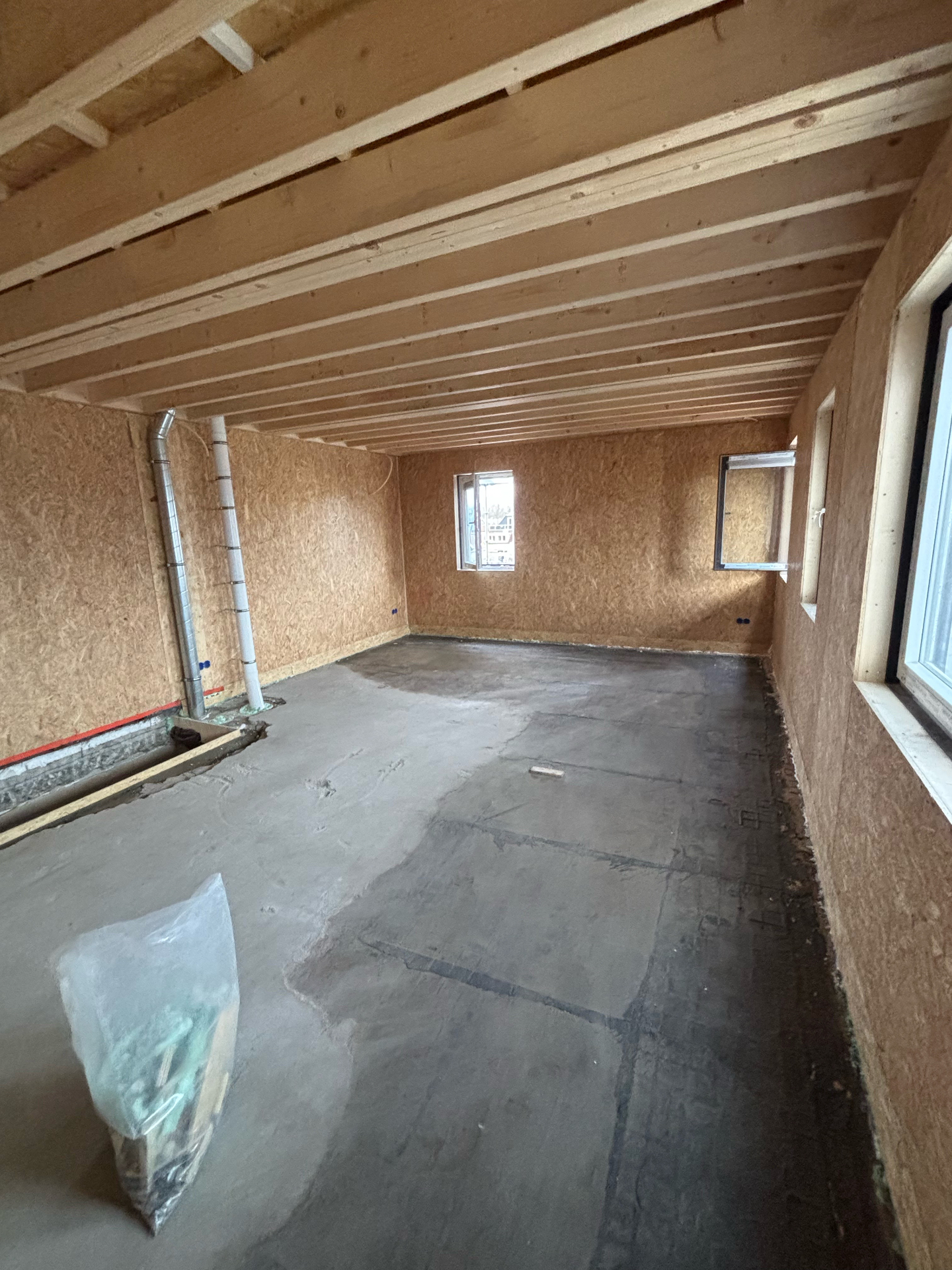 - Interieur voorbereidingen: ruwe cementdekvloer, ventilatiekanalen en basis elektra zijn aangebracht zichtbaar op de foto’s.