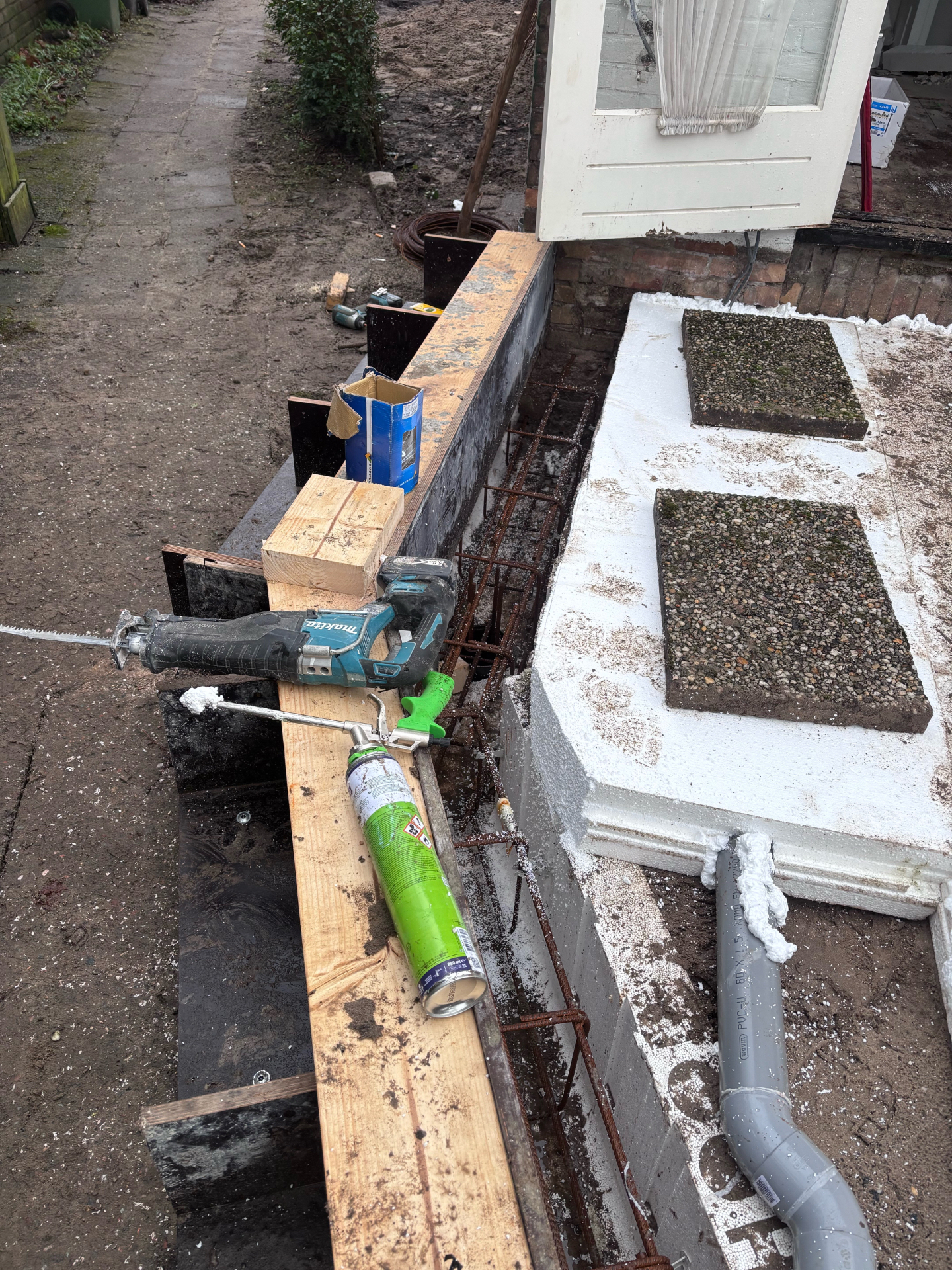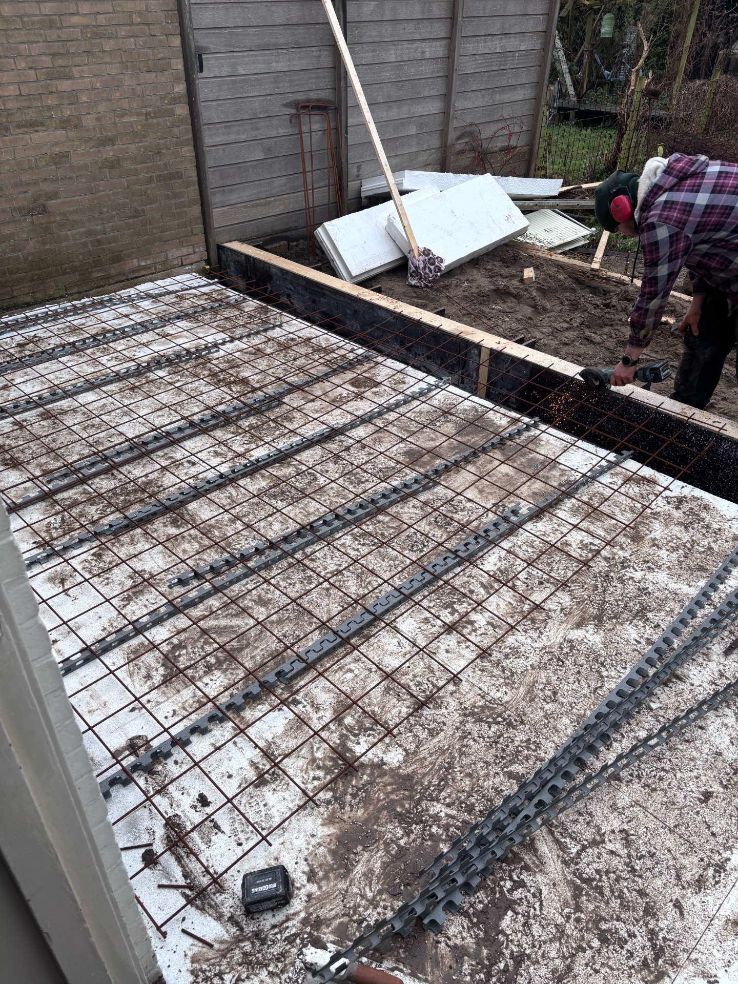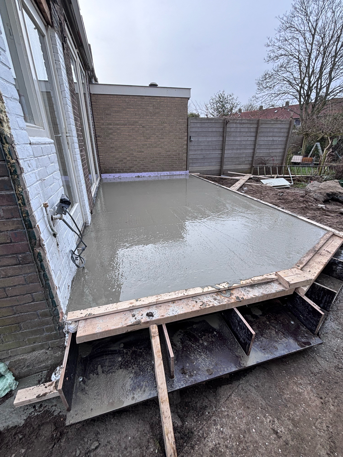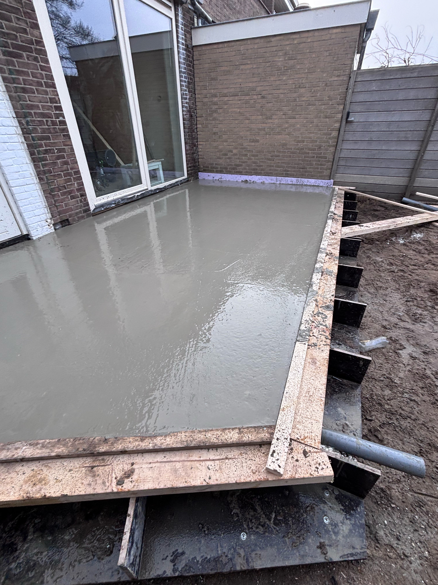 - De randen zijn tijdelijk voorzien van bekisting met houten regels, die een strakke vorm en afwerking mogelijk maken.