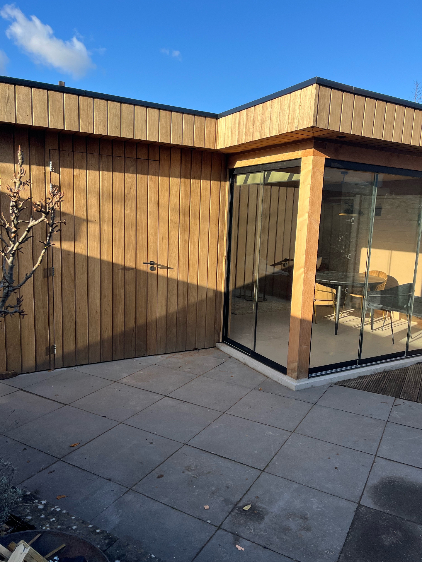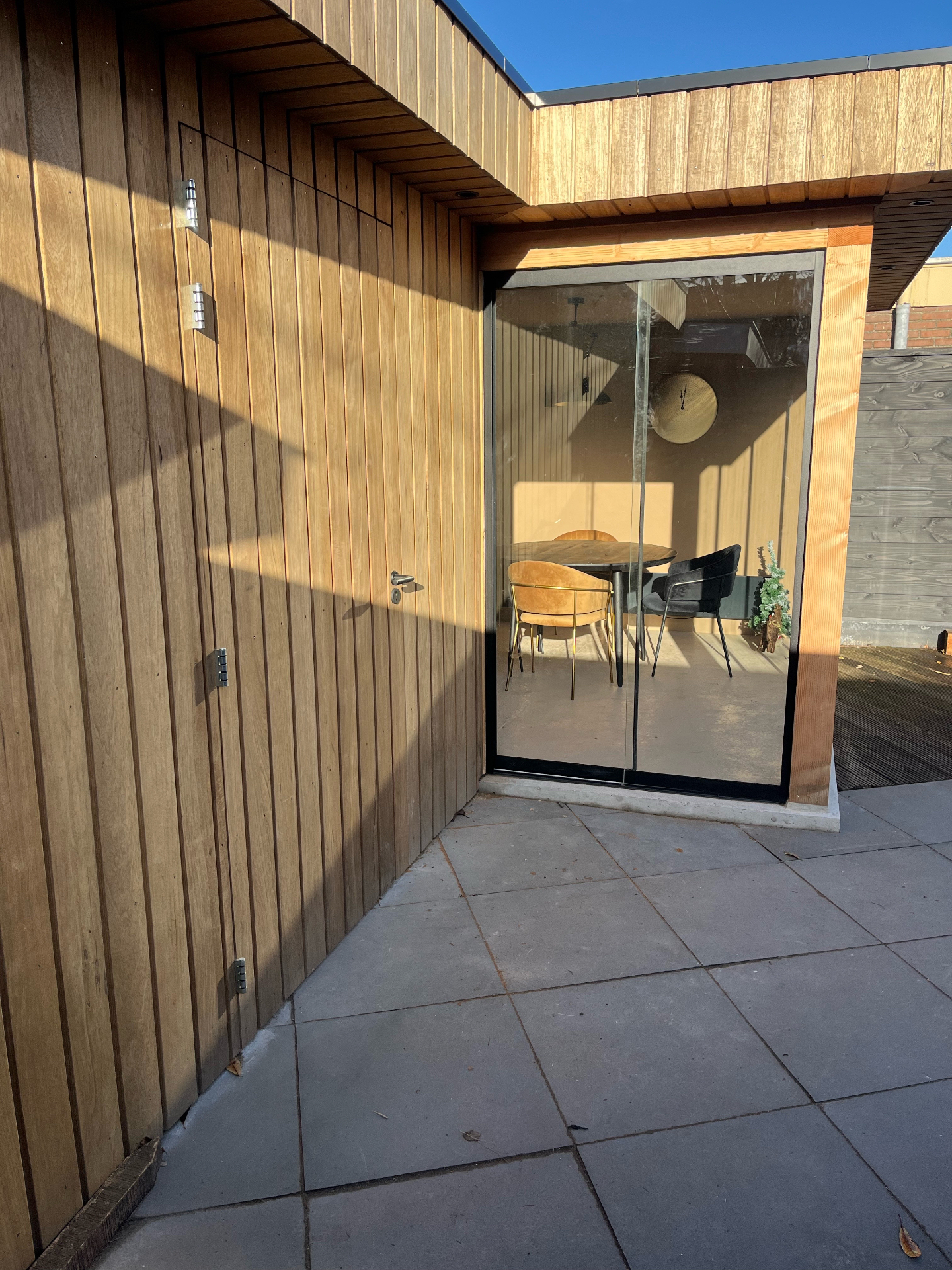 Esthetisch is gekozen voor strakke, verticale hardhouten latten en een slanke zwarte aluminium schuifpui; technisch zorgden we voor een waterdichte aansluiting, een verankerde betonplint en een droog, geïsoleerd binnenklimaat.