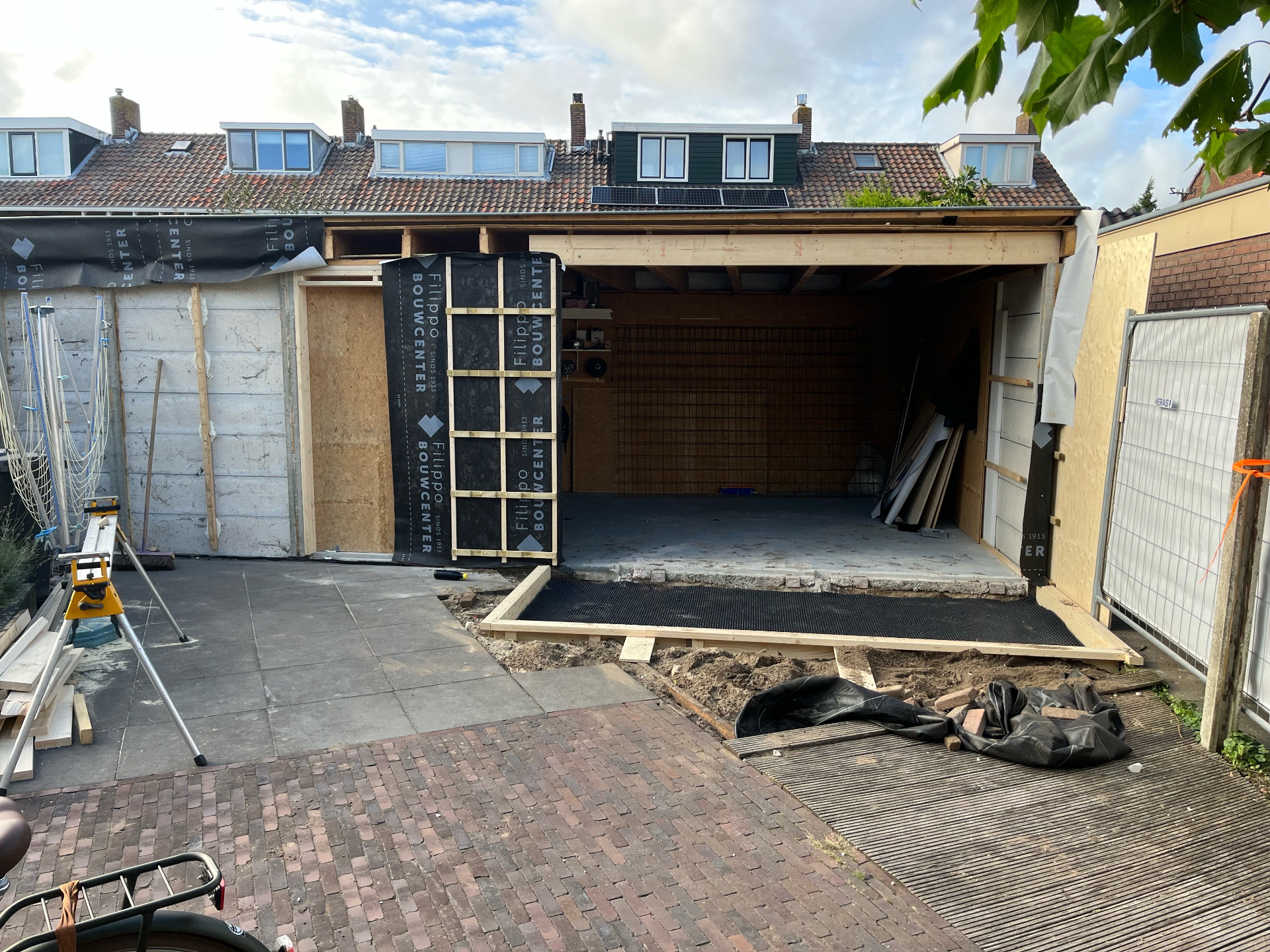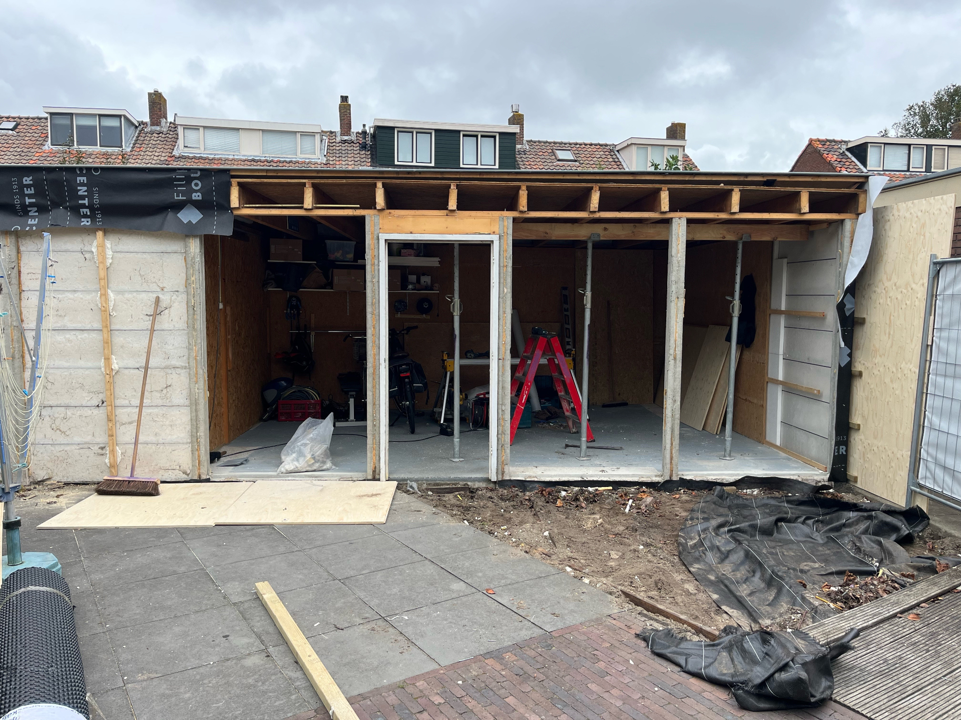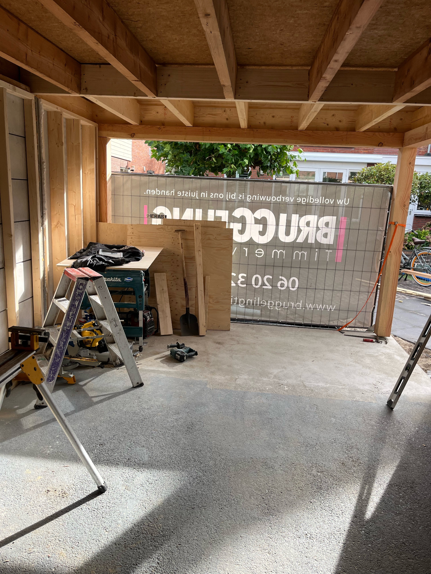 Bij de Familie Langeveld hebben we een bestaande schuur gedeeltelijk gesloopt en uigebreid naar een hoogwaardige tuinkamer/veranda. De foto’s tonen het volledige traject: sloop en stempeling, nieuw betonplint en vloer, houtskelet op maat en de eindafwerking met een hoekige glazen pui en verticale houten bekleding. Binnen is duidelijk zichtbaar hoe het daglicht via een royale lichtstraat en grote glasvlakken de ruimte vult — precies zoals de bewoners wilden.