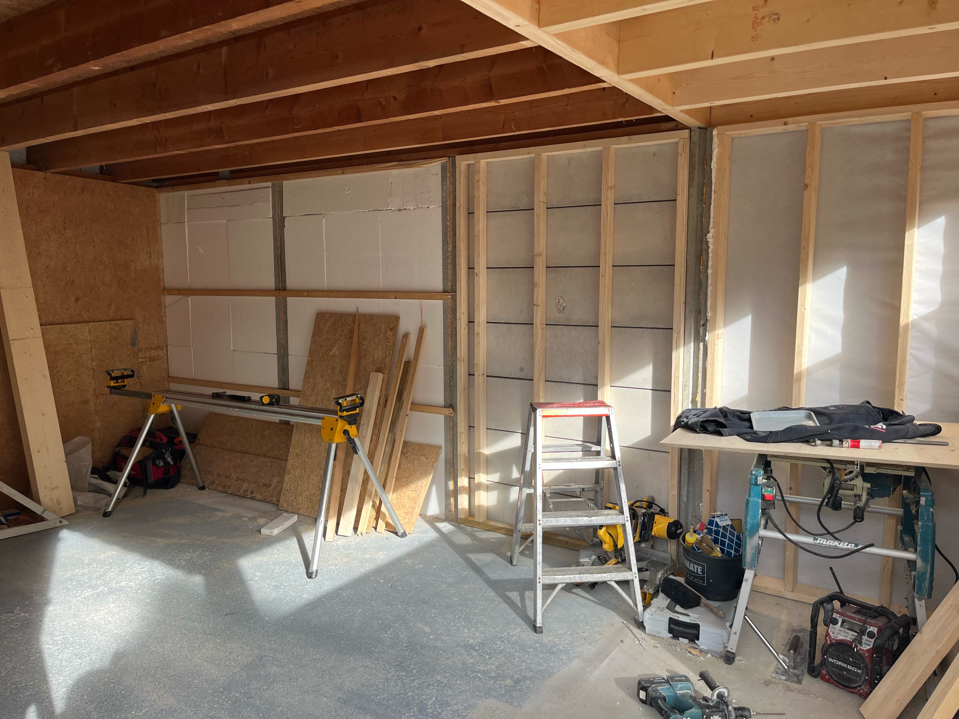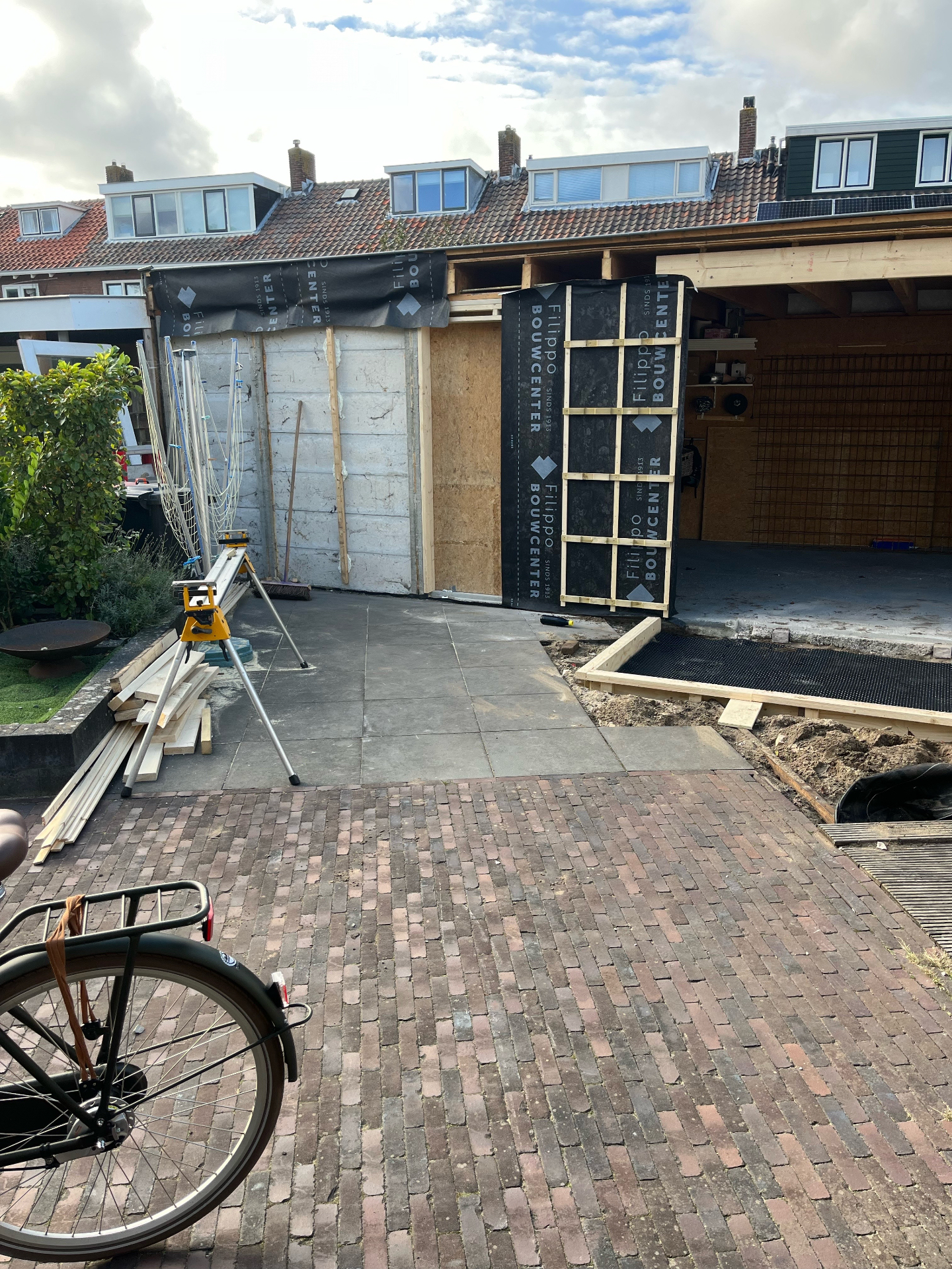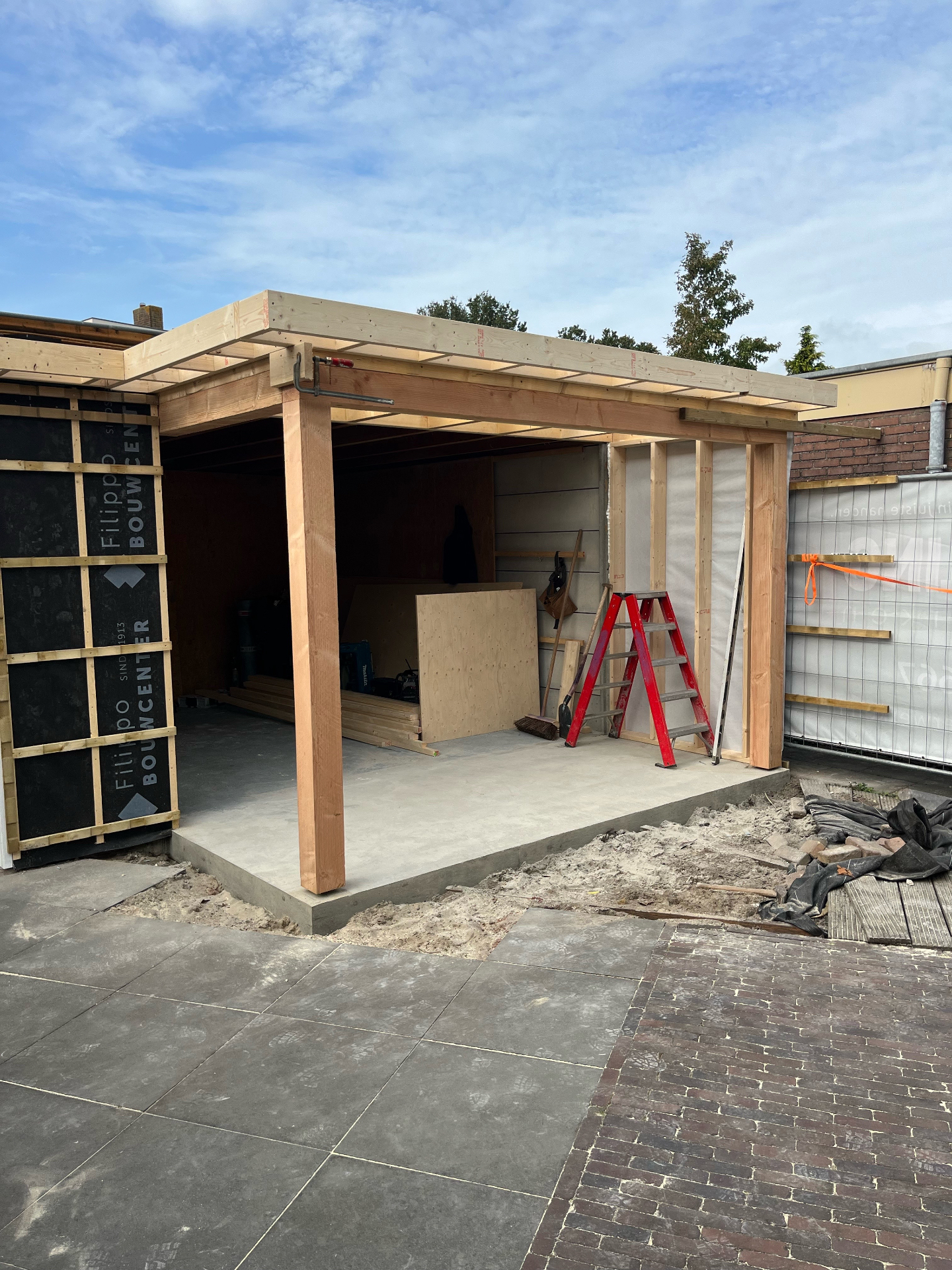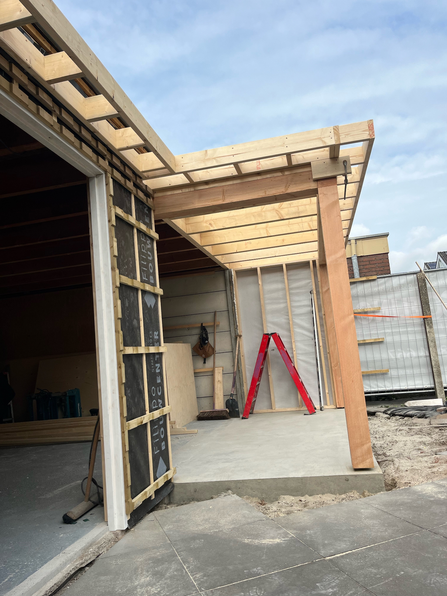 Bij de Familie Langeveld hebben we een bestaande schuur gedeeltelijk gesloopt en uigebreid naar een hoogwaardige tuinkamer/veranda. De foto’s tonen het volledige traject: sloop en stempeling, nieuw betonplint en vloer, houtskelet op maat en de eindafwerking met een hoekige glazen pui en verticale houten bekleding. Binnen is duidelijk zichtbaar hoe het daglicht via een royale lichtstraat en grote glasvlakken de ruimte vult — precies zoals de bewoners wilden.